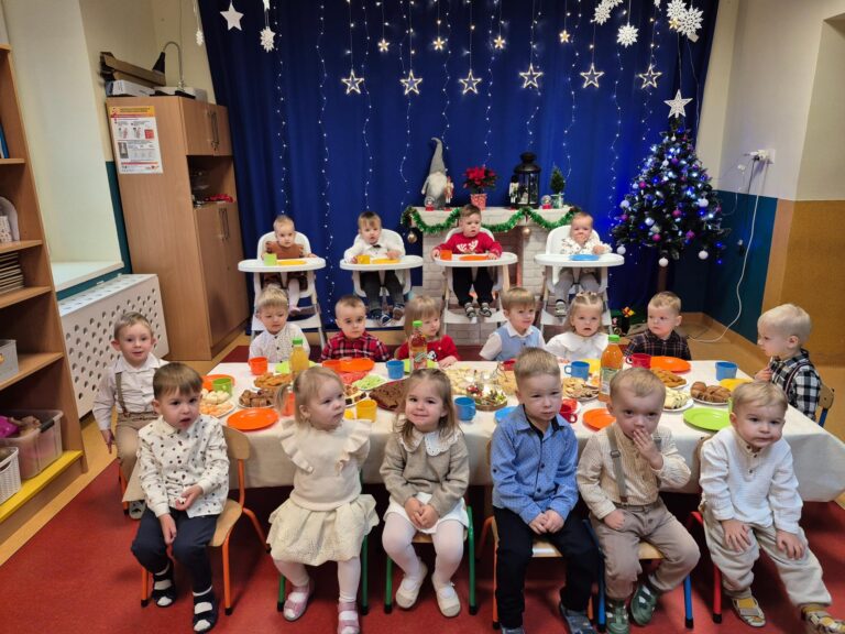 Wigilia w żłobku była pełna ciepła, radości i świątecznej atmosfery. Dzieci kosztowały świątecznych smakołyków, które przygotowali rodzice. To wyjątkowy czas budowania bliskości i wprowadzenie najmłodszych w magiczny nastrój Świąt Bożego